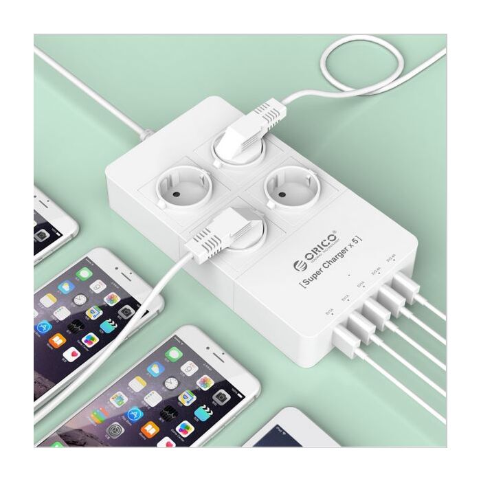 Orico HPC-4A5U Kraftig 5-Ports USB lader med fire stikkontakter